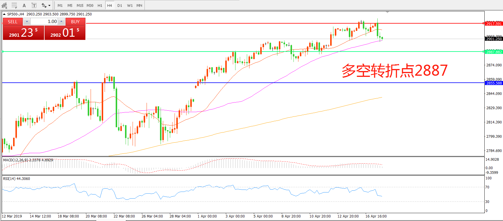 4小时图看,标普500触及2917阻力后再度回落,显示上方阻力较强,目前跌至55周期均线暂时企稳,MACD红柱减少,RSI指标向下,日内有震荡回落可能,重点关注2887一线得失。