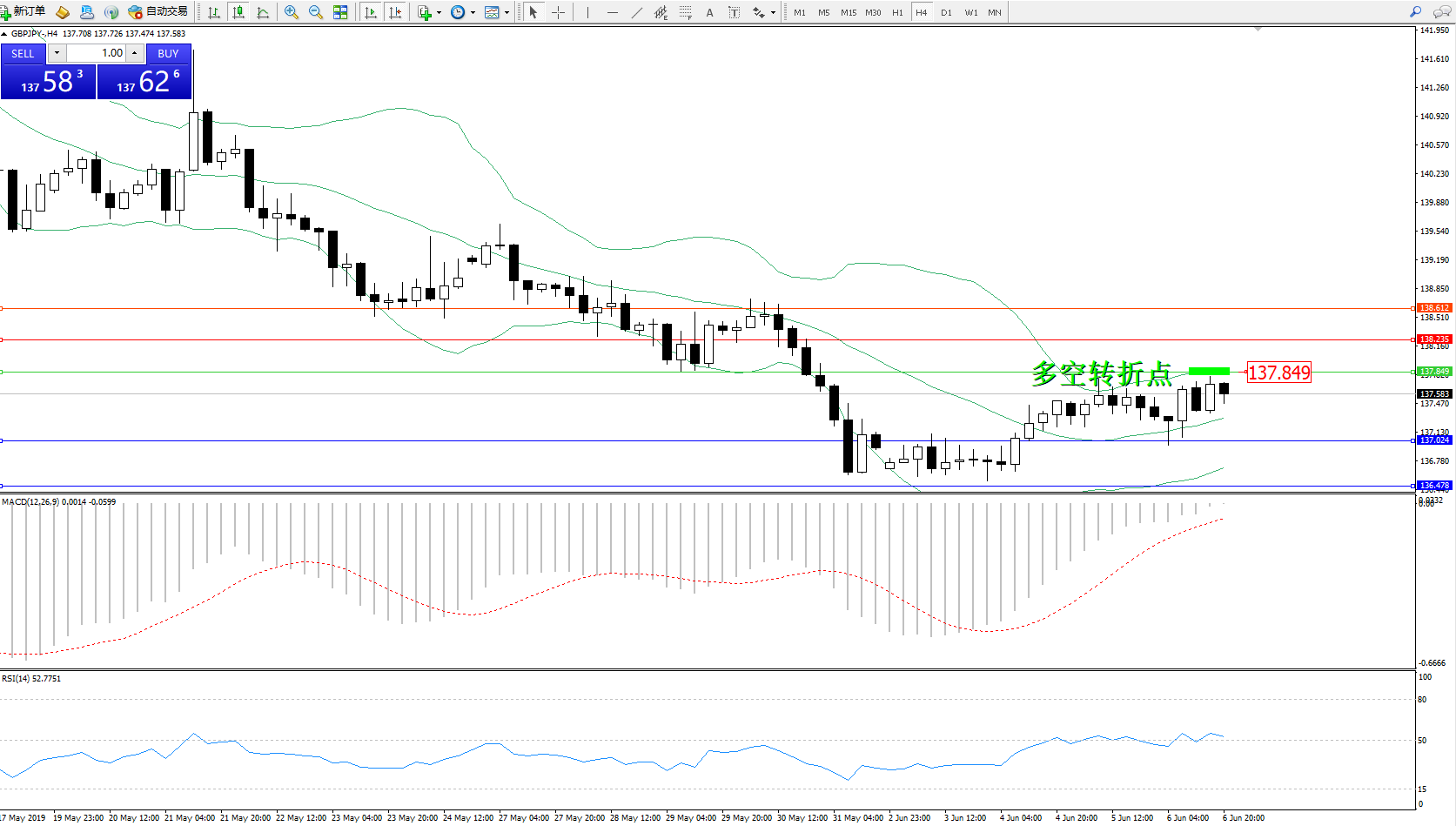 备选策略:137.849上方看涨,目标138.235138.612