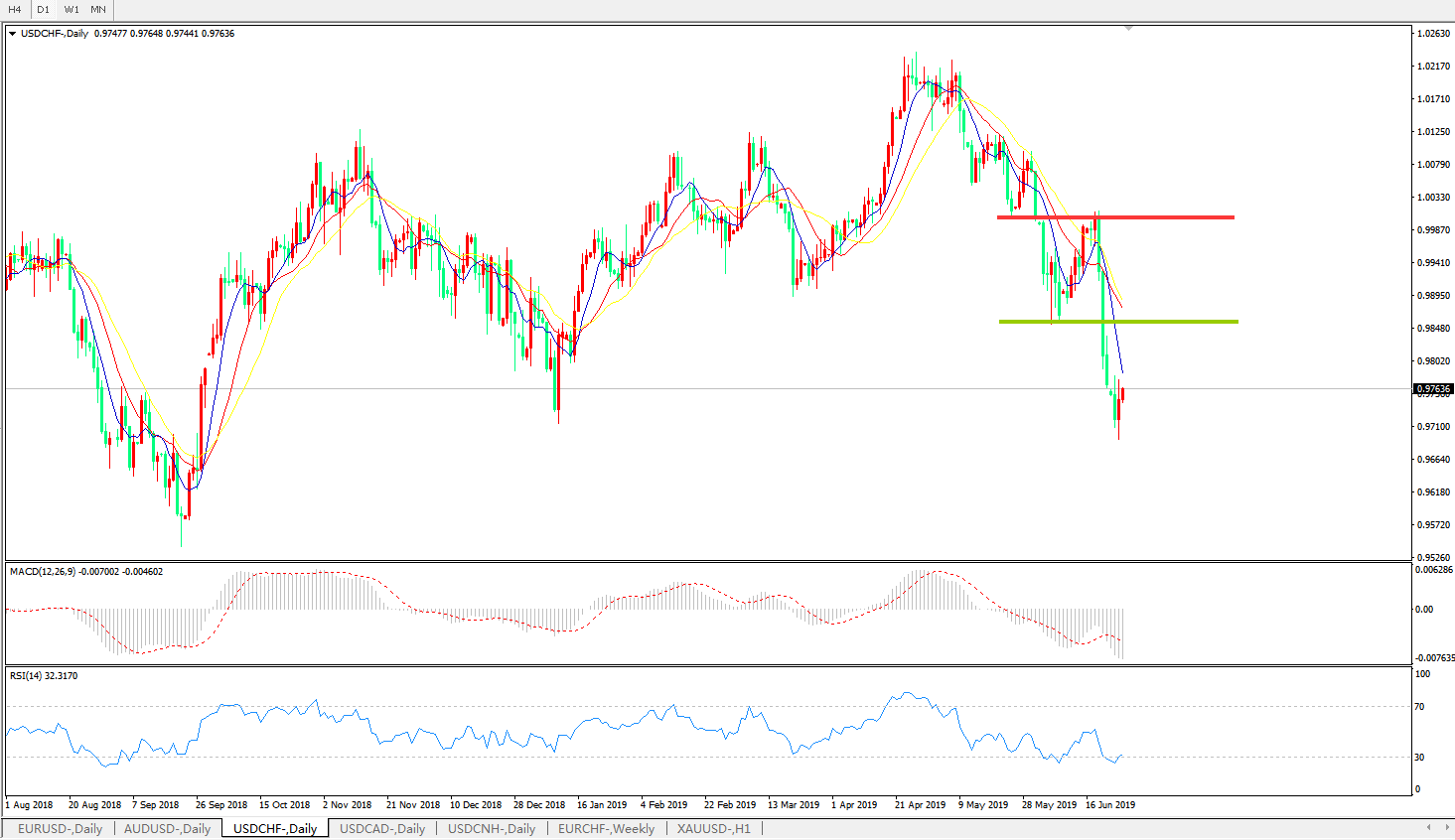 昨日公布的美国经济各项指数大都不及预期和前值,美国经济疲势继续。其中,美国6月谘商会消费者信心指数录得121.5,跌至2017年9月以来最低水平;美国5月新屋销售意外录得62.6万户,已是连续第二个月下滑。花旗首席外汇技术策略师Tom Fitzpatrick称,瑞郎兑美元和兑欧元涨势过度,应当解除美元兑瑞郎空头头寸。美元兑瑞郎上涨0.38%至0.9757瑞郎,此前一度下跌0.3%至2018年9月来最低,过去一周下跌超过2.5%;欧元兑瑞郎在日线图上连续第三天呈现多头背离。