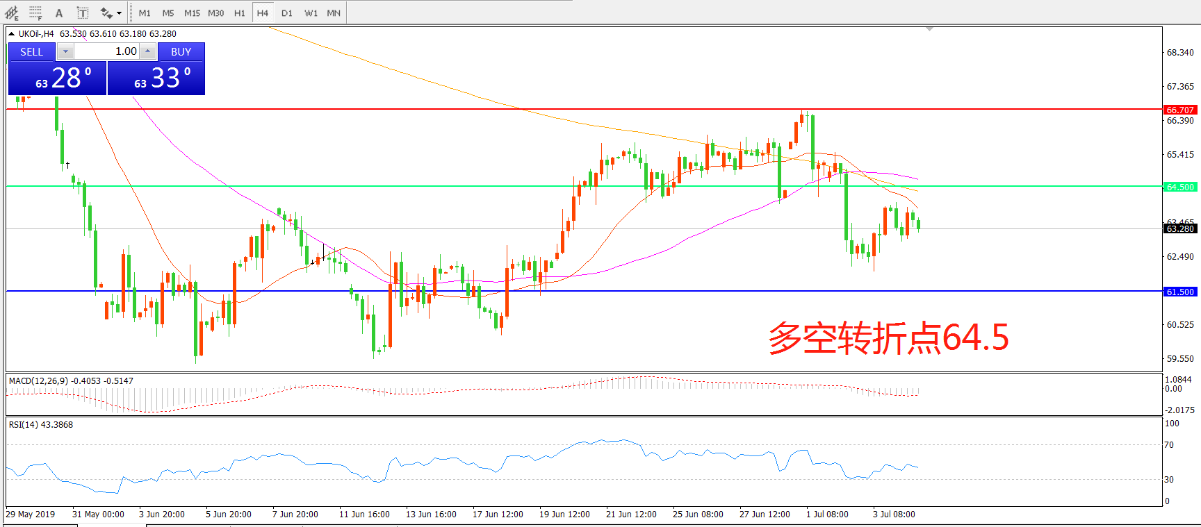 周四(7月4日),布油价格周四在清淡交投中下跌,最终收报63.28美元/桶。尽管欧佩克将减产协议再延长了9个月,但这一利好消息因需求的疲软而大打折扣,经济增长存在的下行压力,给国际油价带来压制。市场在没有理清方向之前,短期不排除仍会有震荡反复。