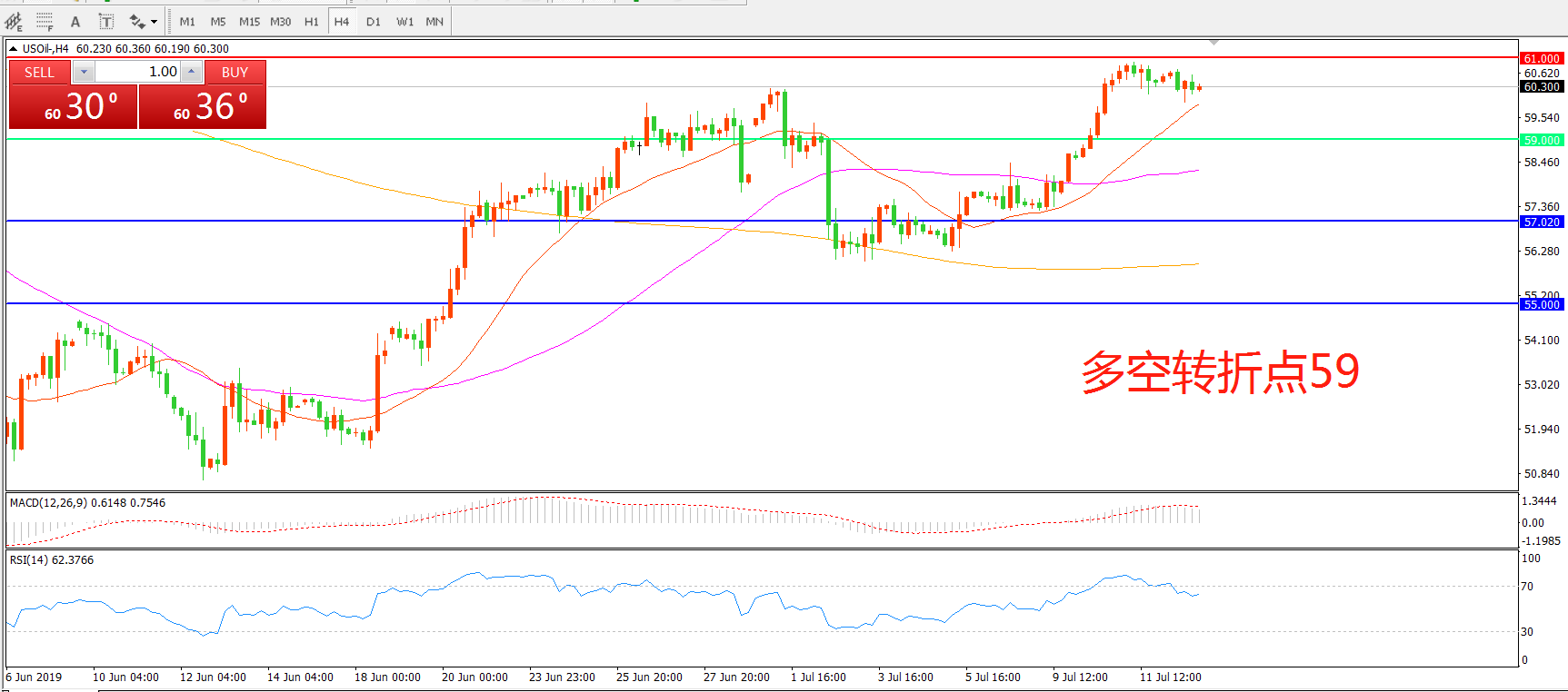 伊朗紧张局势以及美国热带风暴气候为油价提供有效支撑,美国WTI原油上周大涨4.7%,最终收报60.30美元/桶. 美国油服公司贝克休斯周五(7月12日)公布数据显示,截至7月12日当周,美国石油活跃钻井数减少4座至784座,连续两周录得下降且触及2018年2月来新低,利好油价。