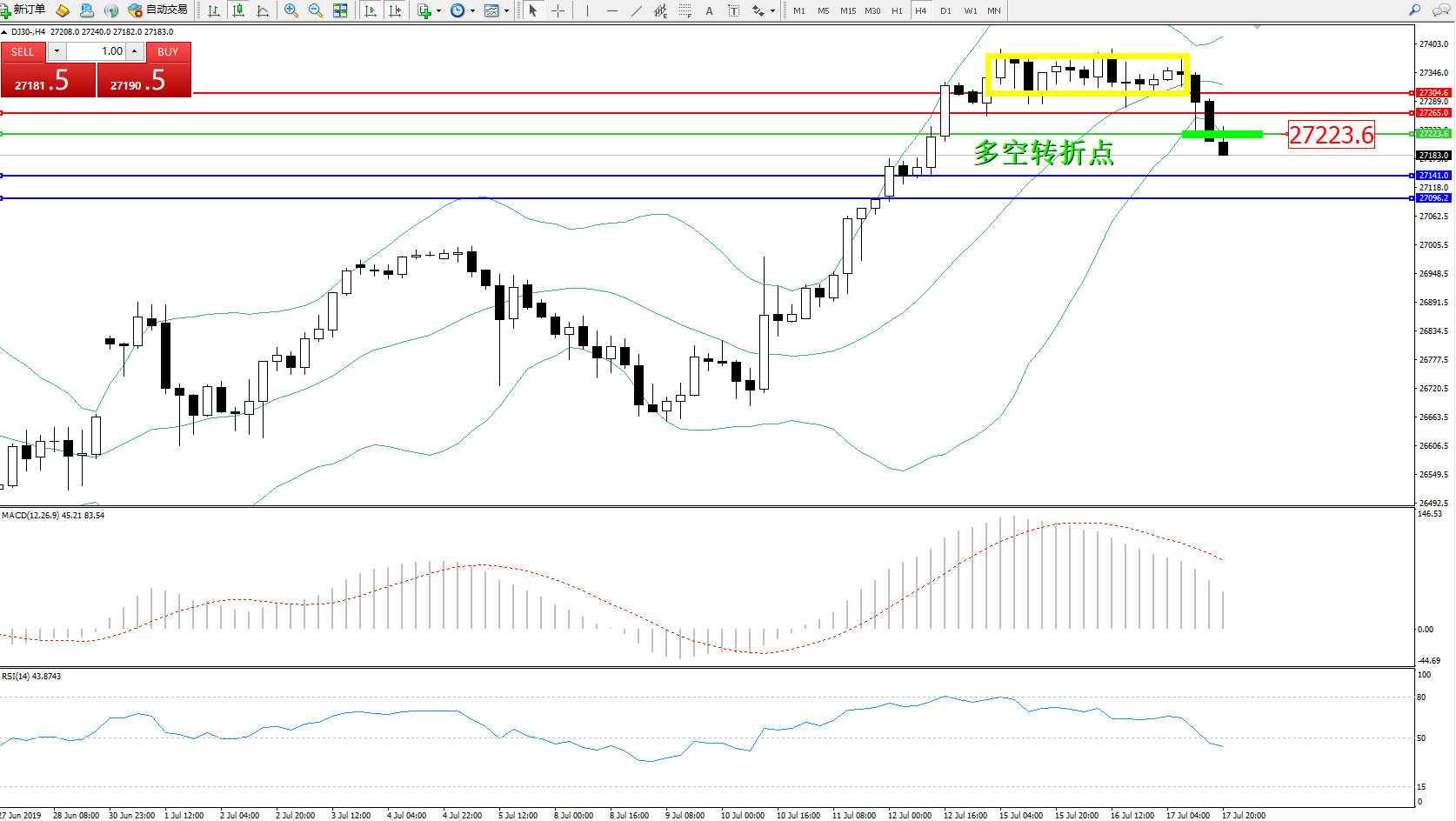 道琼斯指数7月17日(周三)收盘下跌115.80点,跌幅0.42%,报27219.79点。美国新屋开工数据连续2个月下跌,营建许可数据跌至2年来新低,表明尽管抵押贷款利率降低,但房地产市场持续惨淡。FED加速降息概率回升,且全球贸易形势现新爆点。