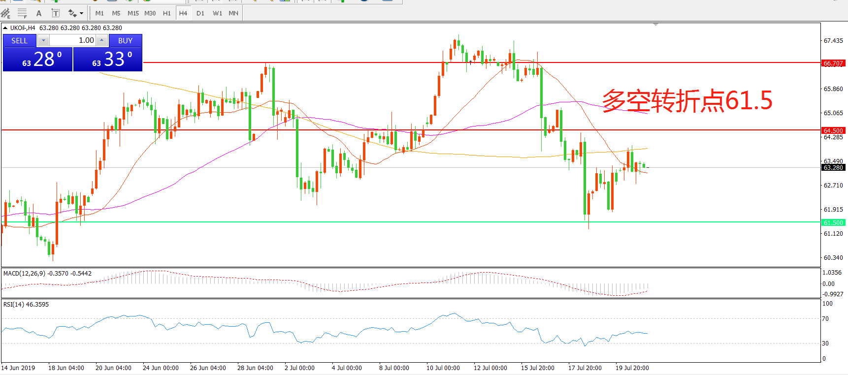 4小时图看,油价长阴破位后以61.5美元为依托展开震荡,短期均线,200周期均线形成上方阻力, MACD绿柱缩短, RSI指标拐头走平,日内延续震荡概率较大。
