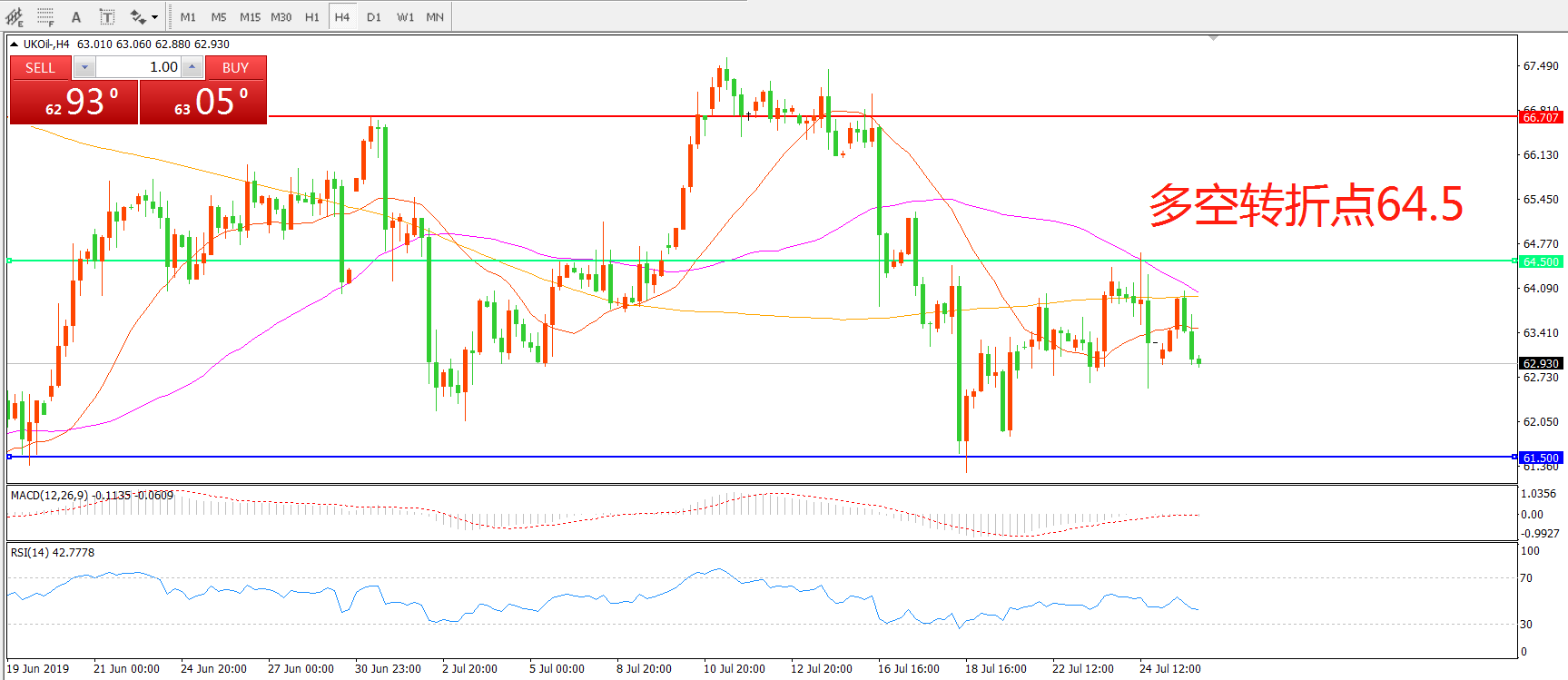 周四(7月24日)欧洲央行维持三大利率不变,但调整了前瞻指引,预计将保持现有关键利率水平不变或者更低水平至少至2020年上半年。欧洲央行声明称,在相当长的一段时期内,需要采取高度宽松的货币政策立场,因为无论是现实的还是预期的通胀率,都一直低于其目标水平。央行的宽松政策为油价提供了一定的支撑,但由于对经济增长放缓可能减少燃料需求的担忧挥之不去,布油昨日冲高回落,收报62.93美元/桶。