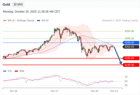 在 4280.00 之下,看跌,目标价位为 4185.00 ,然后为 4145.00 。