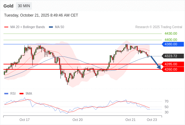在 4380.00 之下,看跌,目标价位为 4285.00 ,然后为 4260.00 。
