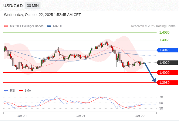 在 1.4045 之下,看跌,目标价位为 1.4000 ,然后为 1.3980 。