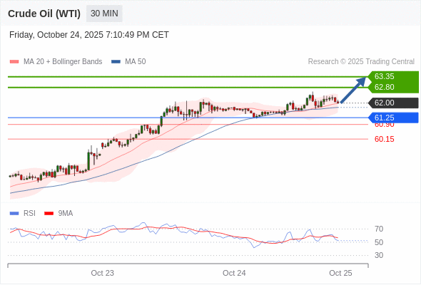 在 61.25 之上,看涨,目标价位为 62.80 ,然后为 63.30 。
