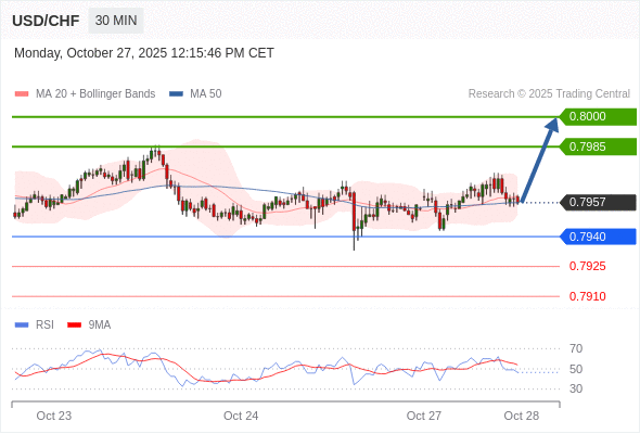 美元/瑞郎 当日内: 在0.7940之上,看涨。
