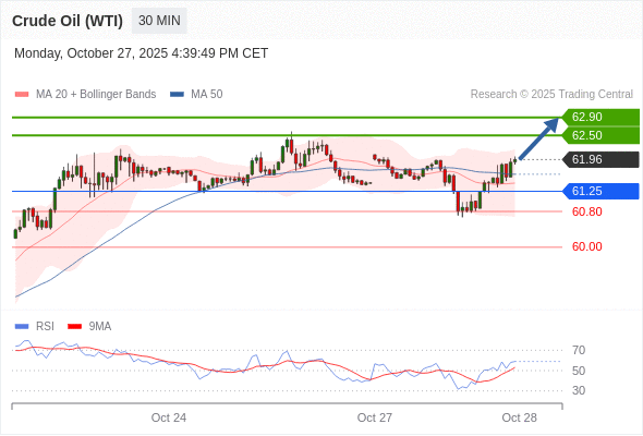 在 61.25 之上,看涨,目标价位为 62.50 ,然后为 62.90 。