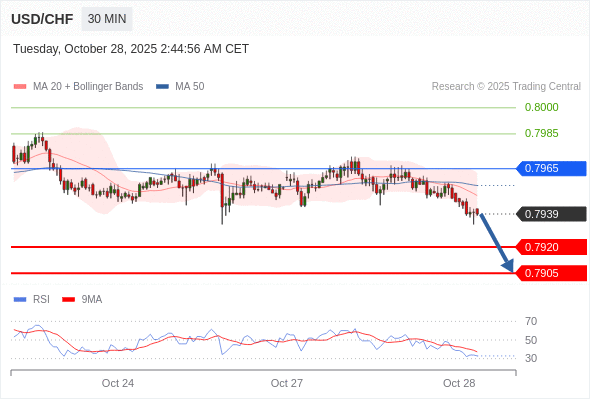 在 0.7965 之下,看跌,目标价位为 0.7920 ,然后为 0.7905 。