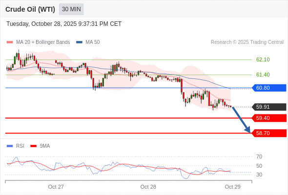 在 60.80 之下,看跌,目标价位为 59.40 ,然后为 58.70 。