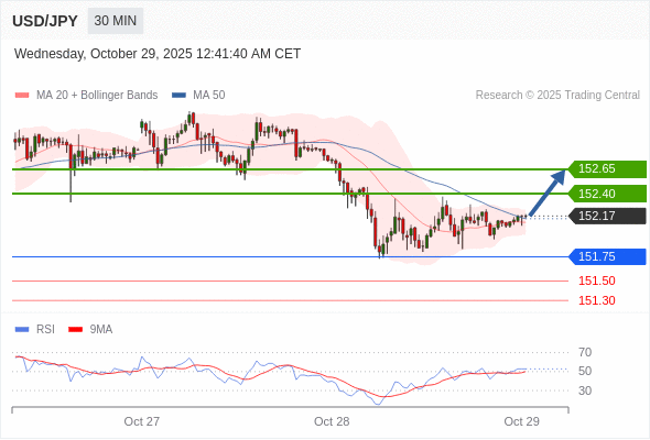 在 151.75 之上,看涨,目标价位为 152.40 ,然后为 152.65 。