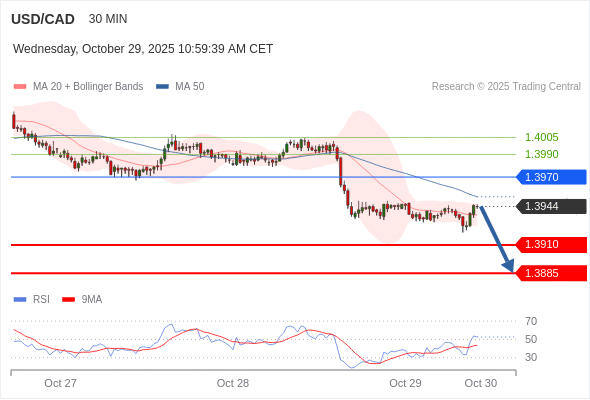 在 1.3970 之下,看跌,目标价位为 1.3910 ,然后为 1.3885 。
