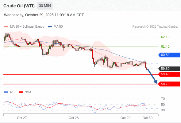 在 60.80 之下,看跌,目标价位为 59.40 ,然后为 58.70 。