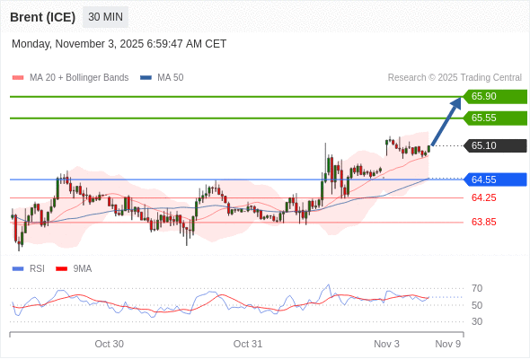 在 64.55 之上,看涨,目标价位为 65.55 ,然后为 65.90 。