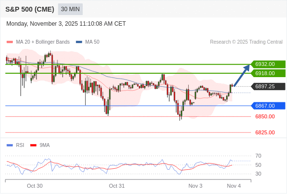 在 6867.00 之上,看涨,目标价位为 6918.00 ,然后为 6932.00 。