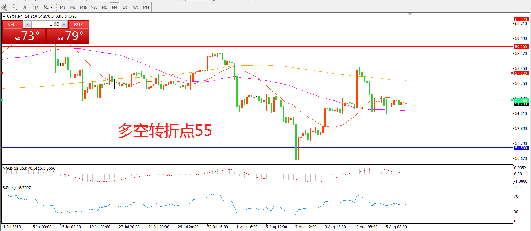 4小时图看,油价呈现窄幅震荡形态,55美元成为上方阻力,整体走势偏弱,55周期均线为下方支撑,MACD红柱减少, RSI指标走平,日内震荡下行概率较大。