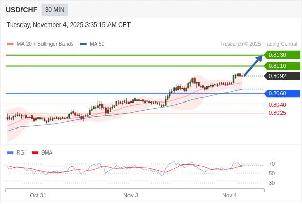在 0.8060 之上,看涨,目标价位为 0.8110 ,然后为 0.8130 。