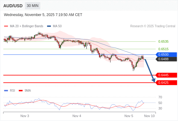 在 0.6500 之下,看跌,目标价位为 0.6445 ,然后为 0.6425 。
