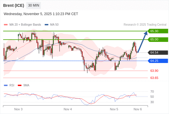 在 64.25 之上,看涨,目标价位为 65.00 ,然后为 65.30 。