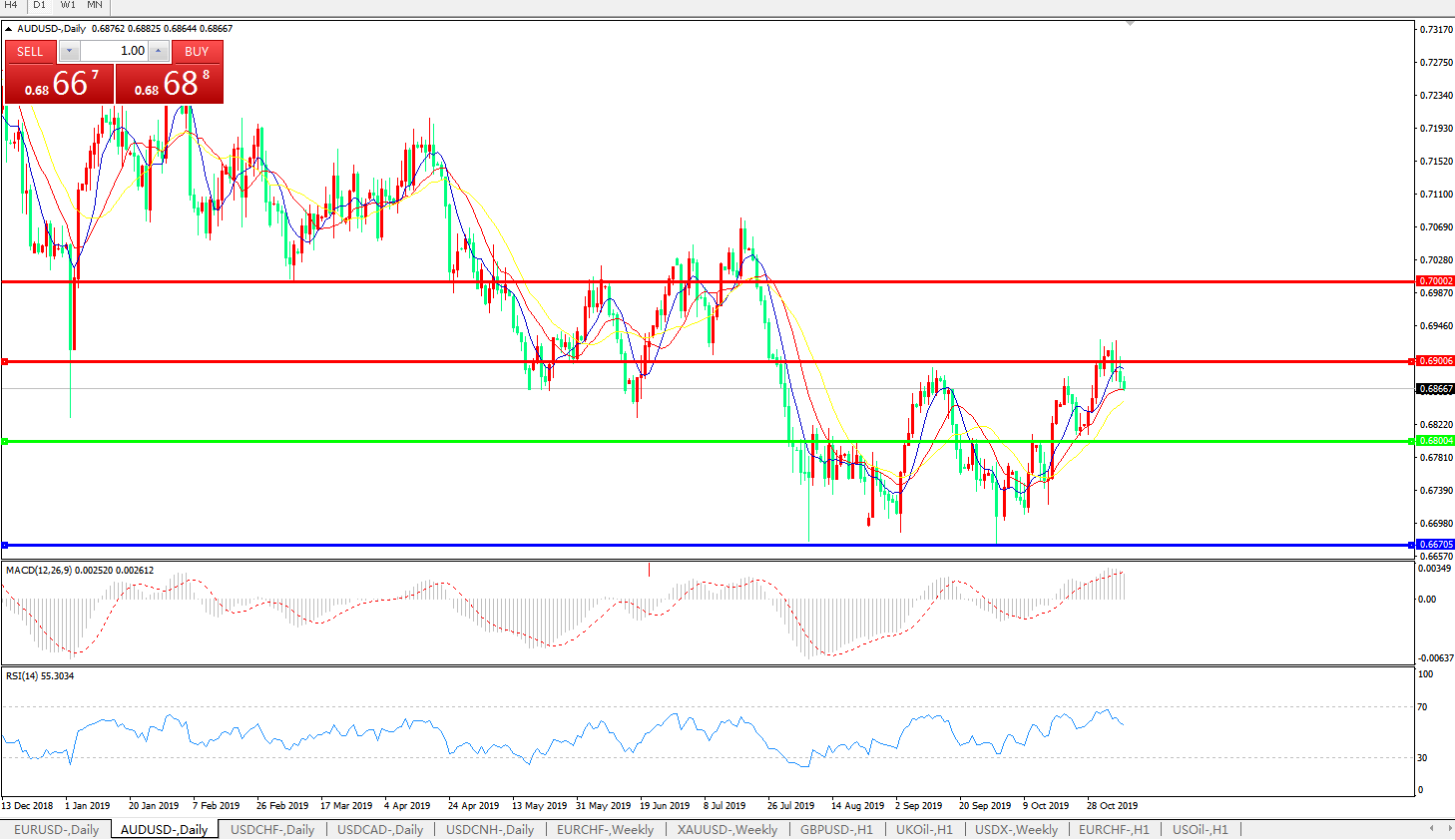 交易策略:0.6800上方看涨,目标0.6900、0.7000