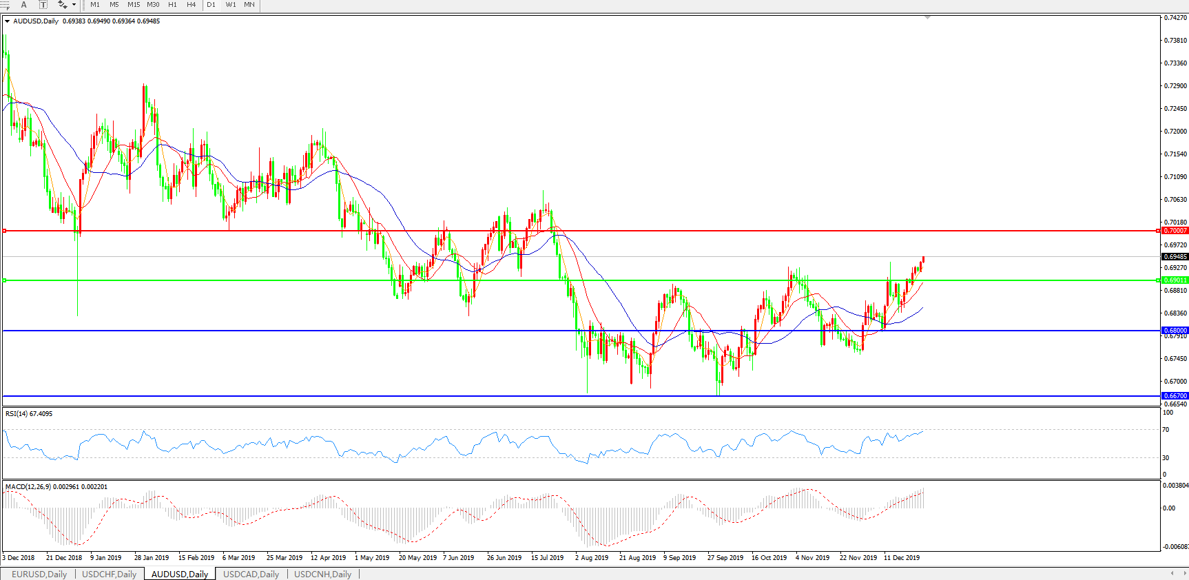 技术面简析:日图均线整体呈多头排列,汇价再度强势上行,MACD继续上攻且量能维持放量,RSI震荡中走高,短线关注0.70关口的压制,预计汇价大概率将进一步走高。