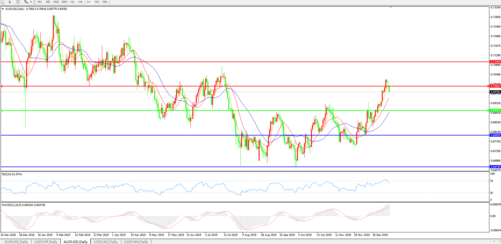 澳元兑美元周四在2020年首个交易日回落,一度重新失守0.70关口,虽然年前在全球风险情绪向好和美元走软推动了澳元汇价持续扶摇直上,并一举升破了200日均线,但是在节后美元指数如预期出现补涨的背景下,澳元的升势便难以再续; 与此同时,日内全球地缘局势再趋紧张的消息,连同投资者仍然押注澳洲联储将在上半年降息两次的前景一同,也拖累了澳元走软,因而,澳元兑美元能否站稳0.70关口并进一步确认中期反转走势,依旧存有疑虑,这也推动投资者在此前澳元多头仓位持续获利后采取了回吐操作;市场仍密切关注全面贸易局势的下一步走向,而这是澳元中长期趋势方向的关键。汇价短线支撑位在节前12月31日的低点0.6994,如果失守,意味着汇价短线或需要更深回调才能重新蓄势上行。