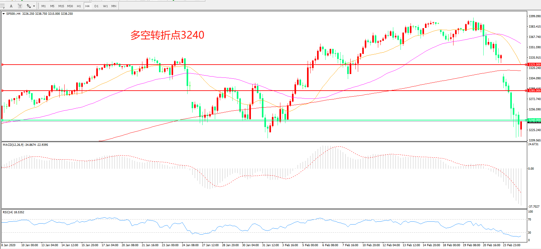4小时图看,标普500低开低走,整体表现低迷,短期均线拐头向下,MACD绿柱增加,RSI指标向下,日内延续下行概率较大。