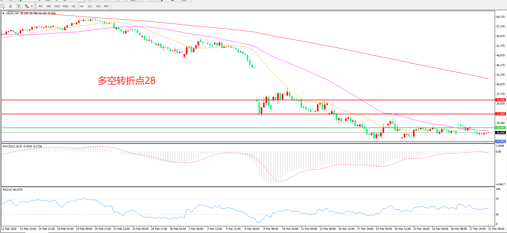 4小时图看,布油延续低位震荡,整体波幅不大,28美元成为短期多空分水岭,55周期均线逐渐下压,MACD绿柱减少,RSI指标走平,日内延续震荡概率较大。