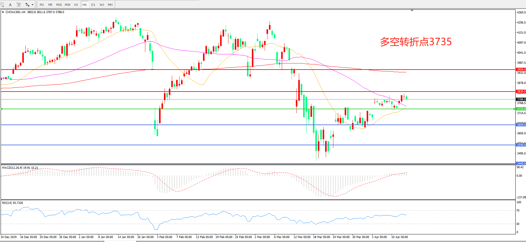 4小时图看,沪深300延续高位震荡,整体波幅不大,短期均线拐头向上,有形成金叉迹象,MACD红柱增加,RSI指标走平,日内延续上行概率较大。