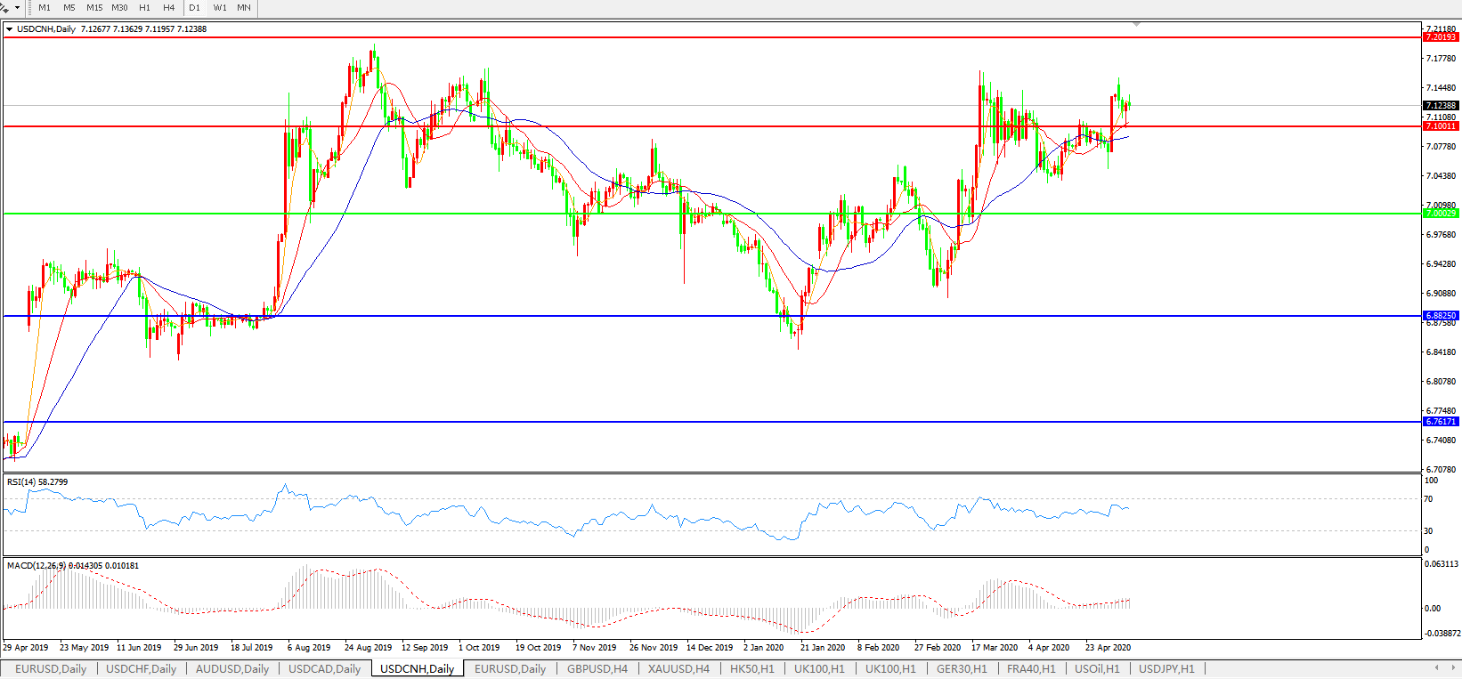 技术面简析:日图均线延续多头排列,汇价回落整理后再度上行,MACD小幅走升且量能开始放量,RSI冲高回落整理,预计短期汇价或将进一步上行,关注7.1关口的争夺。