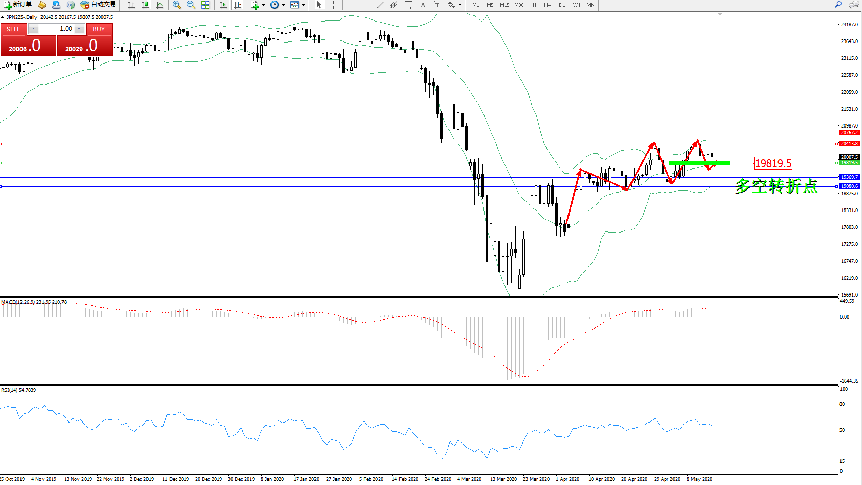 日经225指数5月15日(周五)收盘上涨104.72点,涨幅0.53%,报20019.50点。有关美联储必须采取负利率来降低赤字成本的说法似乎站不住脚;虑到美联储为缓解融资市场压力所做的所有工作,包括与外国央行建立互换机制和贴现窗口措施,美联储不太可能支持可能导致流动性紧张的举措。投资者似乎开始看跌美国股市,贸易关系继续向着恶化的方向发展,来自美国的数据非常黯淡,美国国债上涨,收益率几乎全线下跌。日本私营部门顾问向首相建议:政府应该采取必要的经济措施,同时关注经济增长、失业率和财政债务,提议帮助旅游、餐饮、娱乐等行业摆脱疫情重灾区,政府应该制定基本方针,开展经济活动和预防冠状病毒传播,同时为第二、第三波病毒感染做好准备。日本央行今日购买了15亿日元的日本房地产投资信托基金。