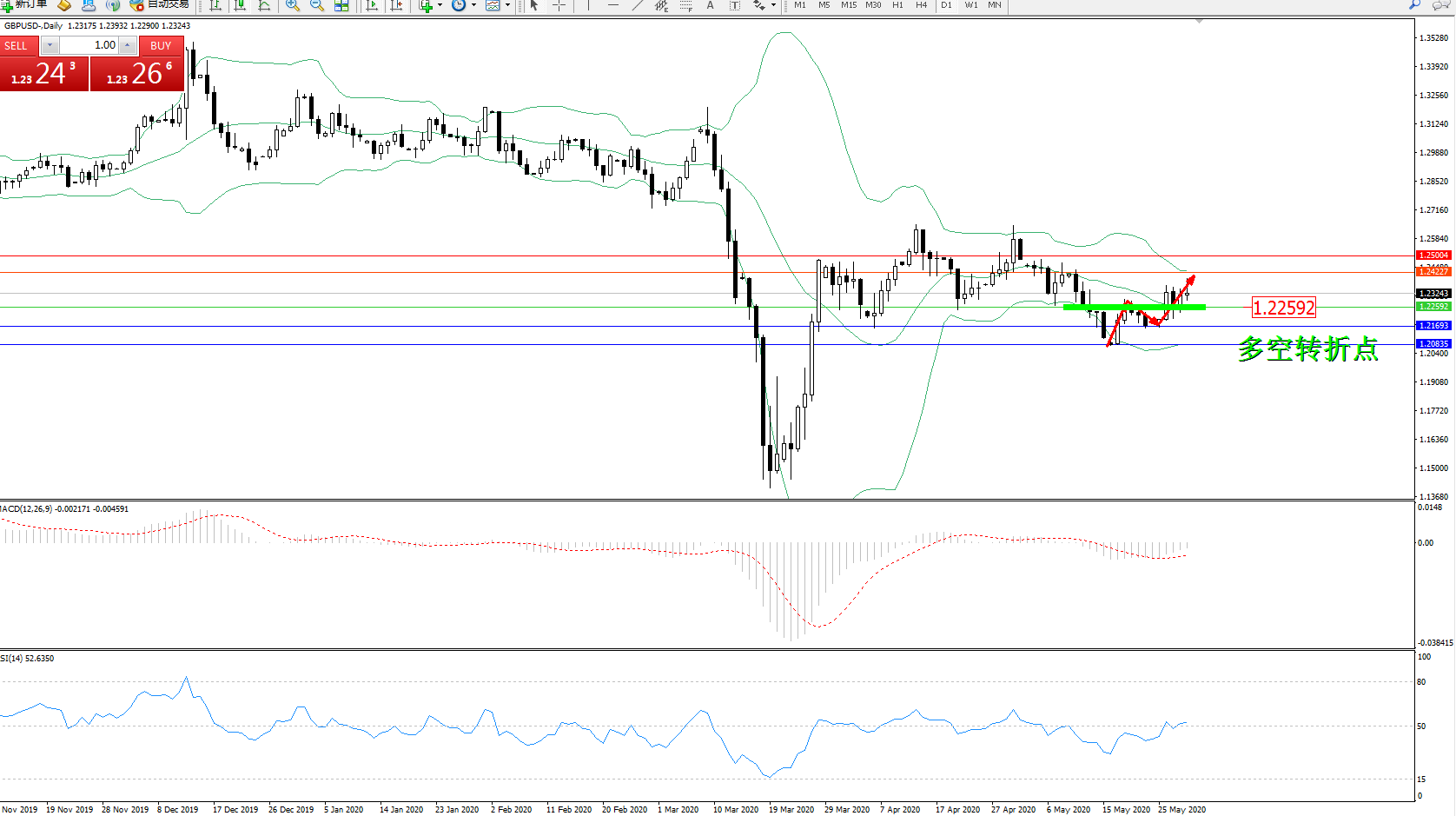 交易策略:1.22592上方看涨,目标1.24227、1.25004