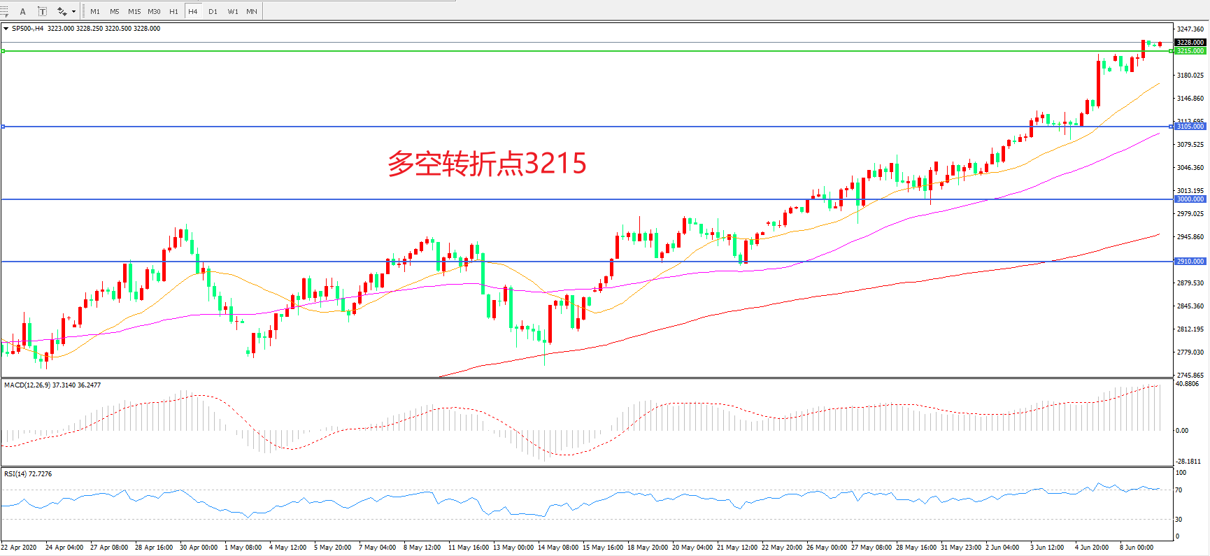 4小时图看,标普500长阳拉升,整体表现十分强势,均线系统呈多头排列,MACD红柱增加,RSI指标走平,日内延续上行概率较大。