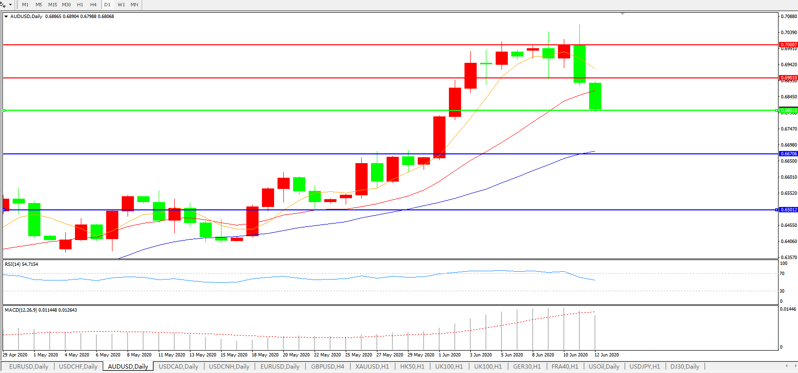 交易策略:0.6800上方看涨,目标0.6900、0.7000