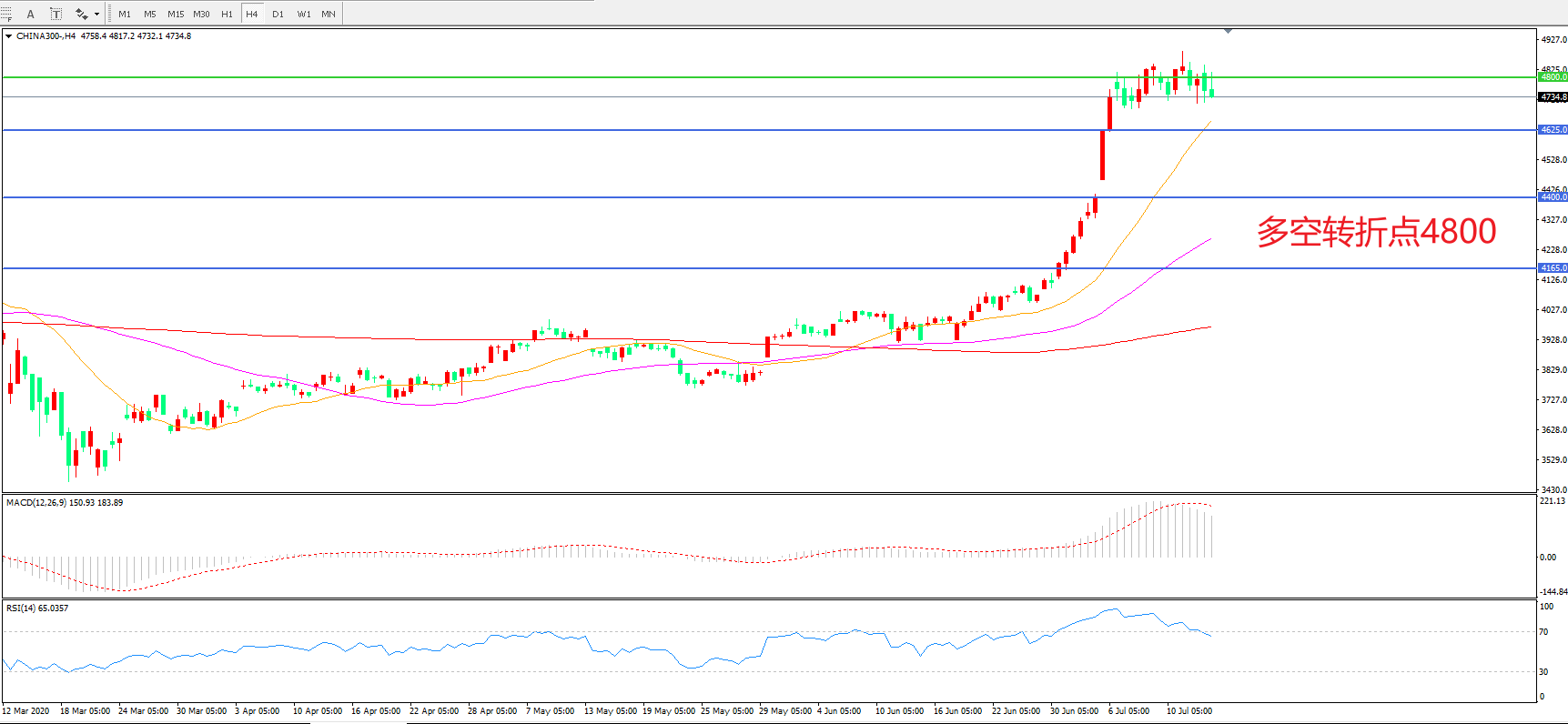 4小时图看,沪深300延续高位震荡,4800成为短期阻力,上行走势暂缓,均线系统逐渐发散, MACD红柱减少,RSI指标向上,日内延续震荡概率较大。