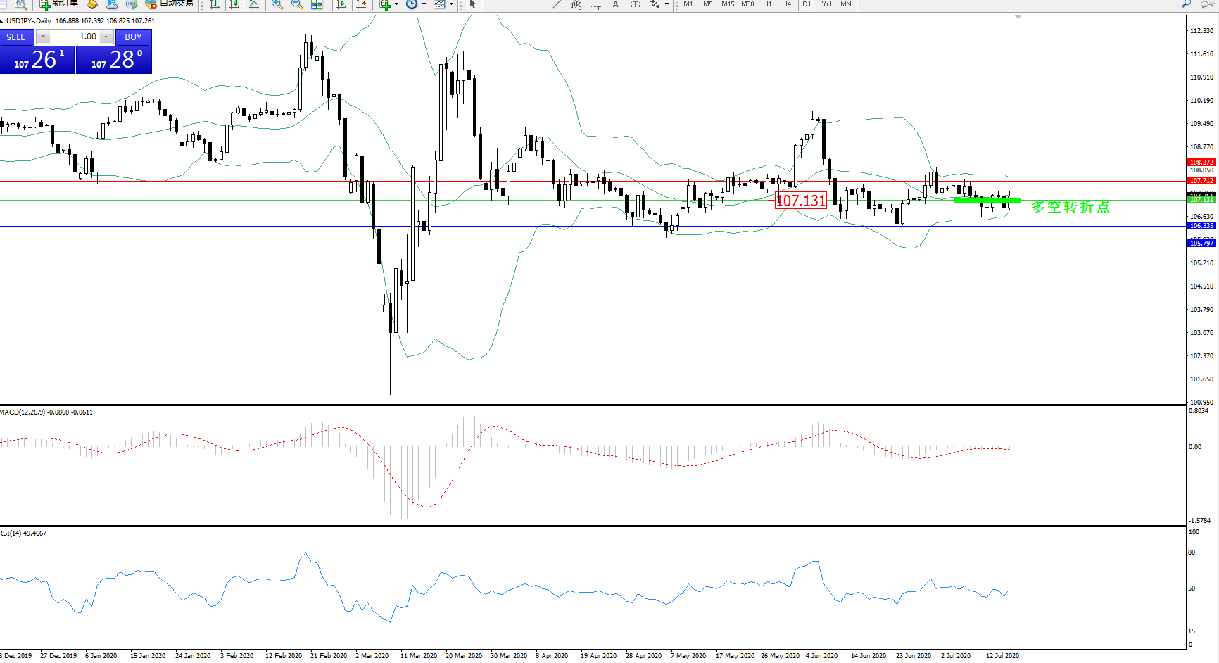 交易策略:107.131下方看跌,目标106.335105.797