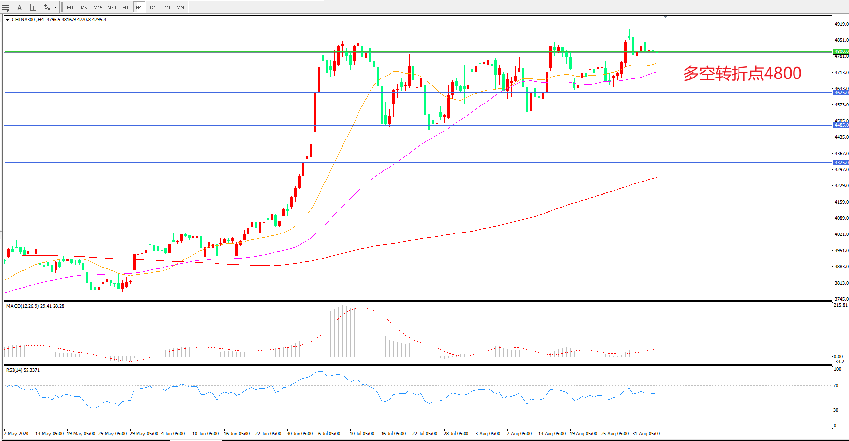 4小时图看,沪深300冲高回落,高位震荡迹象明显,4800成为多空争夺焦点,均线系统走平, MACD红柱增加,RSI指标走平,日内延续上行概率较大。