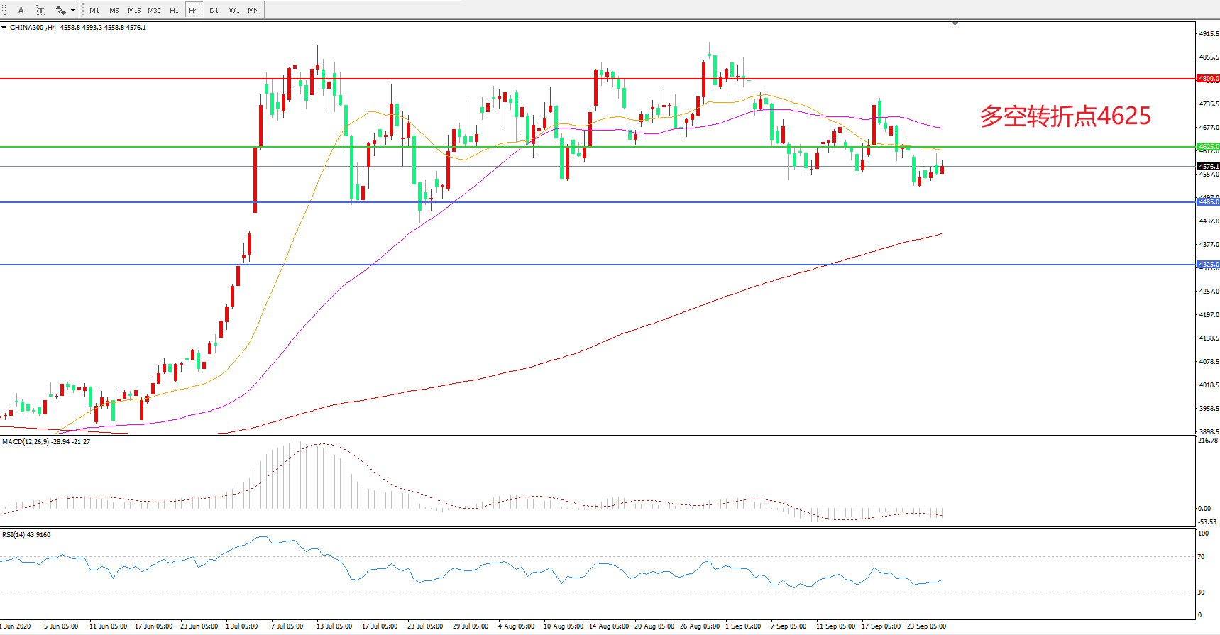 4小时图看,沪深300延续低位震荡,短期走势相对低迷,4625成为多空分水岭,均线系统走平, MACD绿柱增加,RSI指标走平,日内延续震荡概率较大。