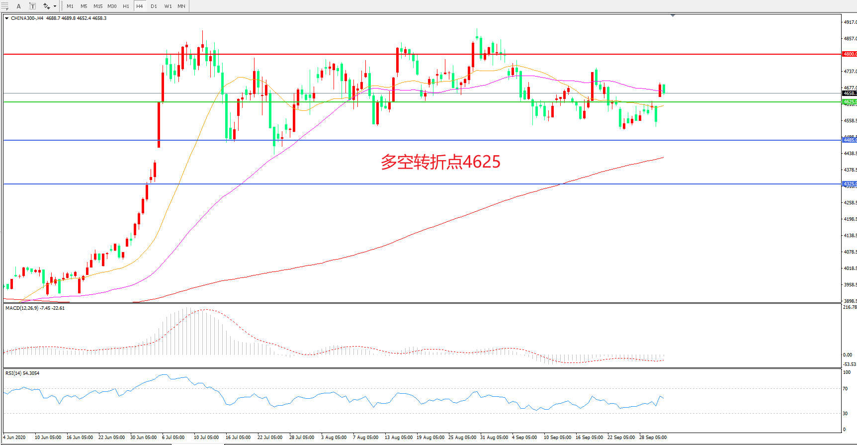 4小时图看,沪深300跳空高开,尾盘虽有回落,但整体表现有所回暖,4625成为多空分水岭,均线系统走平, MACD绿柱增加,RSI指标走平,日内延续震荡概率较大。