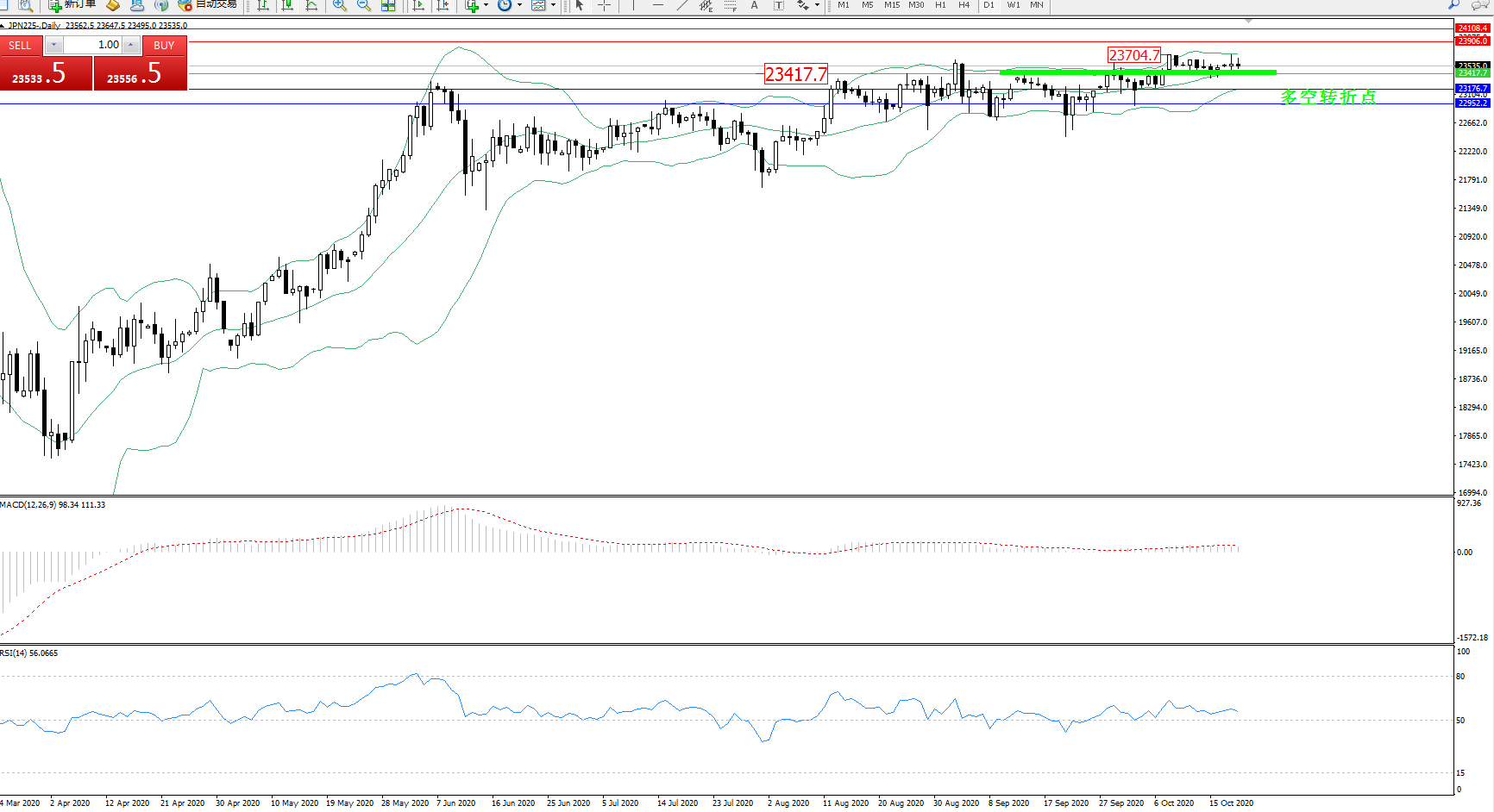 日经225指数10月20日(周二)收盘下跌124.63点,跌幅0.53%,报23546.50点。亚洲股市跟随隔夜欧美股市跌势,因美国政治担忧加剧;投资人在临近美国大选前降低曝险,此外美国达成财政刺激的截止日期愈发临近,而且欧洲单日新冠感染人数创下纪录新高。虽然市场担心美国刺激方案,但近期跌势可能是11月3日美国大选前的仓位调节动作所致。市场日益忧心美国大选结果可能发生争议的风险,亦加深全球投资者的审慎情绪。在美国达成各方接受的解决结论之前,这样的事件非常可能严重打击全球市场,投资人也观望周四美国总统大选最后一场辩论会中,现任总统特朗普和民主党候选人拜登能否扭转选情局势。根据分析,美国上周新增新冠病毒病例数增加13%至超过39.3万例,逼近夏季高峰时的水准。