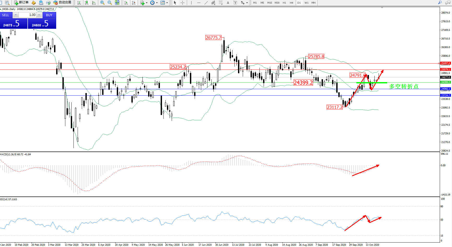 香港恒生指数10月21日(周三)收盘上涨184.88点,涨幅0.75%,报24754.42点;港股恒指全天高位震荡,恒生科技指数走低明显,工信部同意电信、移动开展eSIM技术应用服务,电信股全线爆发,中国联通大涨超11%,中电信涨9.2%;黄金、汽车板块延续近期涨势,恒生科技股多数下跌,大型科技股撑市,美团涨超3%,京东涨1.6%,小米涨0.9%;军工股、半导体跌幅居前,苹果概念股普遍走低。今日南下资金净流入33.7亿港元,大市成交额为1095亿港元。四季度A股和港股会是震荡向上的走势,周期股可能面临阶段性的补涨行情。中途的调整是非常好的加仓机会,看好港股的新经济、消费等板块。港股有三类标的可以选择,第一是港股特有,A股没有的标的;第二,某些行业的龙头公司在港股;第三,一些标的A股港股都有,但港股的性价比较高。