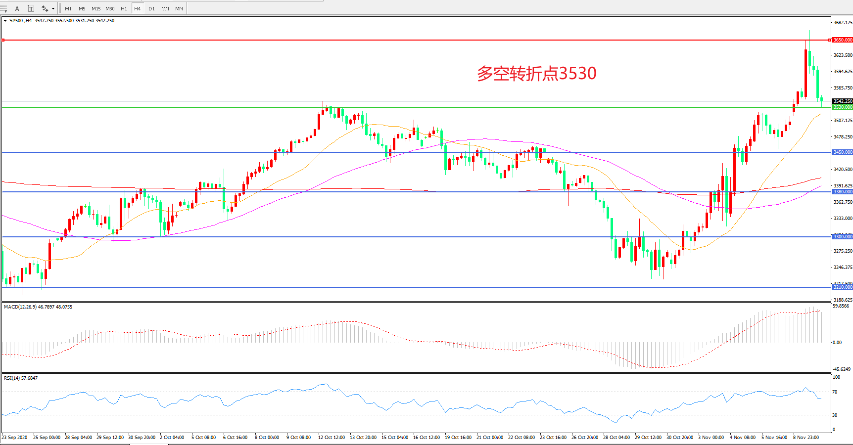 4小时图看,标普500阳线连续拉升,短期表现偏强,虽然未能突破3650阻力,但上行趋势依然明朗,均线系统拐头向上,MACD红柱增加,RSI指标走平,日内震荡上行概率较大。