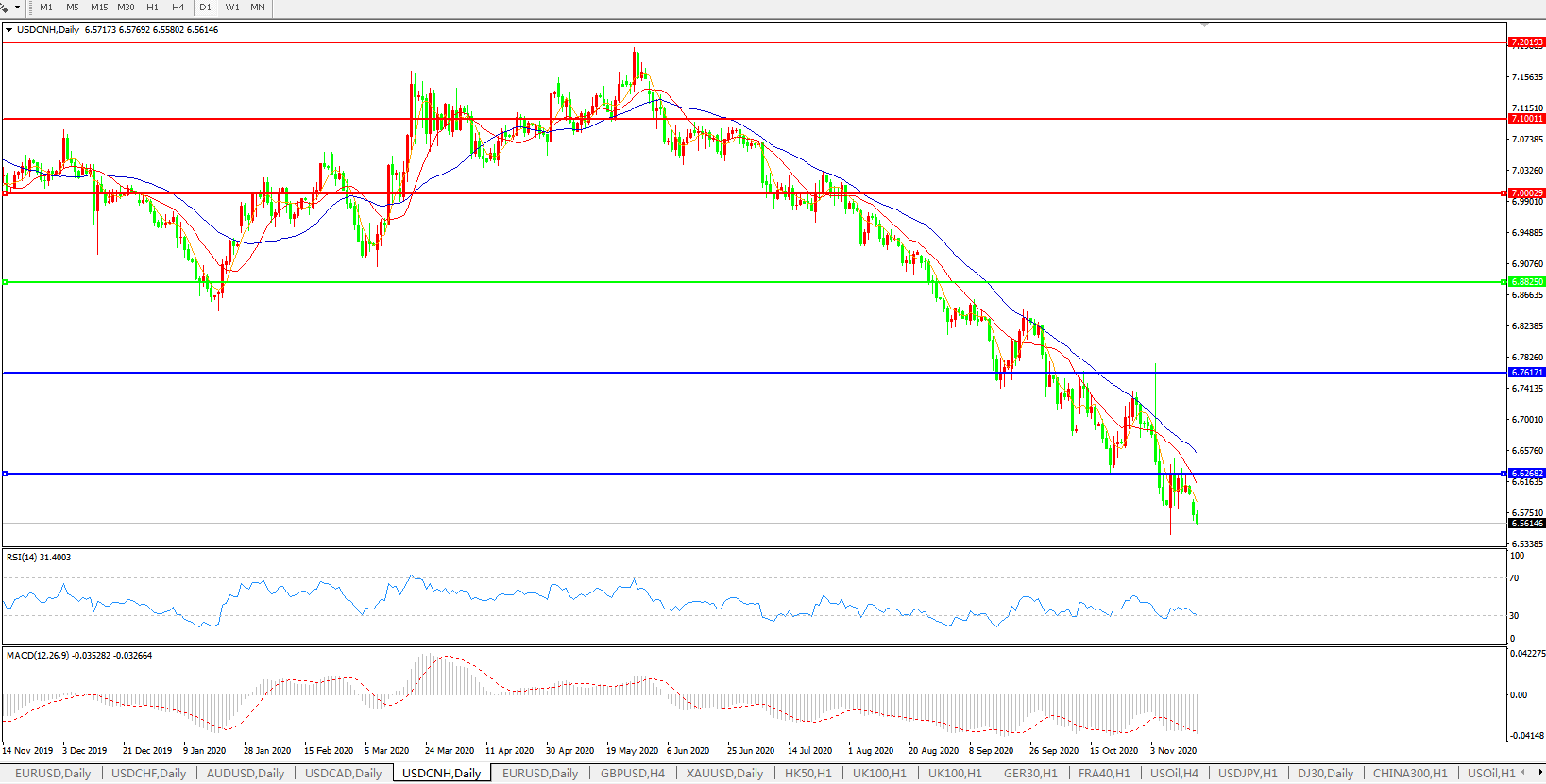 人民币兑美元即期周一收创一周新高,中间价亦升237点至近一周高位;交易员表示,区域全面经济伙伴关系协定(RCEP)签署及较乐观的中国经济数据提振风险偏好,市场关注焦点重回疫情等基本面;中国央行今日开展11月中期借贷便利(MLF)操作8000亿元创近五年新高,在信用风险急升时维稳市场信心;兴业研究最新观点指出,短期内美国大选对风险情绪的提振已被消化,疫苗“出世”的利好弱于预期,市场风险偏好进一步上升的空间不大;兴业研究报告称,11月下旬随着欧元区疫情大概率率先放缓、封锁措施逐步解禁,美元指数有一定的贬值压力,在此之前美元指数可能陷入惯性的收敛震荡,目标区间为92.50-93.50;分析人士认为,RCEP在一定程度上帮助提振风险偏好,投资者希望受到国际紧张局势打击的贸易能因此有改善;中国10月工业超预期,投资消费创年内高点,分析师指出,数据显示中国经济在持续复苏的轨道中,供给和需求端均获改善,预计四季度经济增速较前季有明显提升;全球汇市方面,美元周一兑主要货币下跌,而英镑和欧元则走强,因有迹象显示英国与欧盟关于英国脱欧后的贸易协议谈判可能取得进展