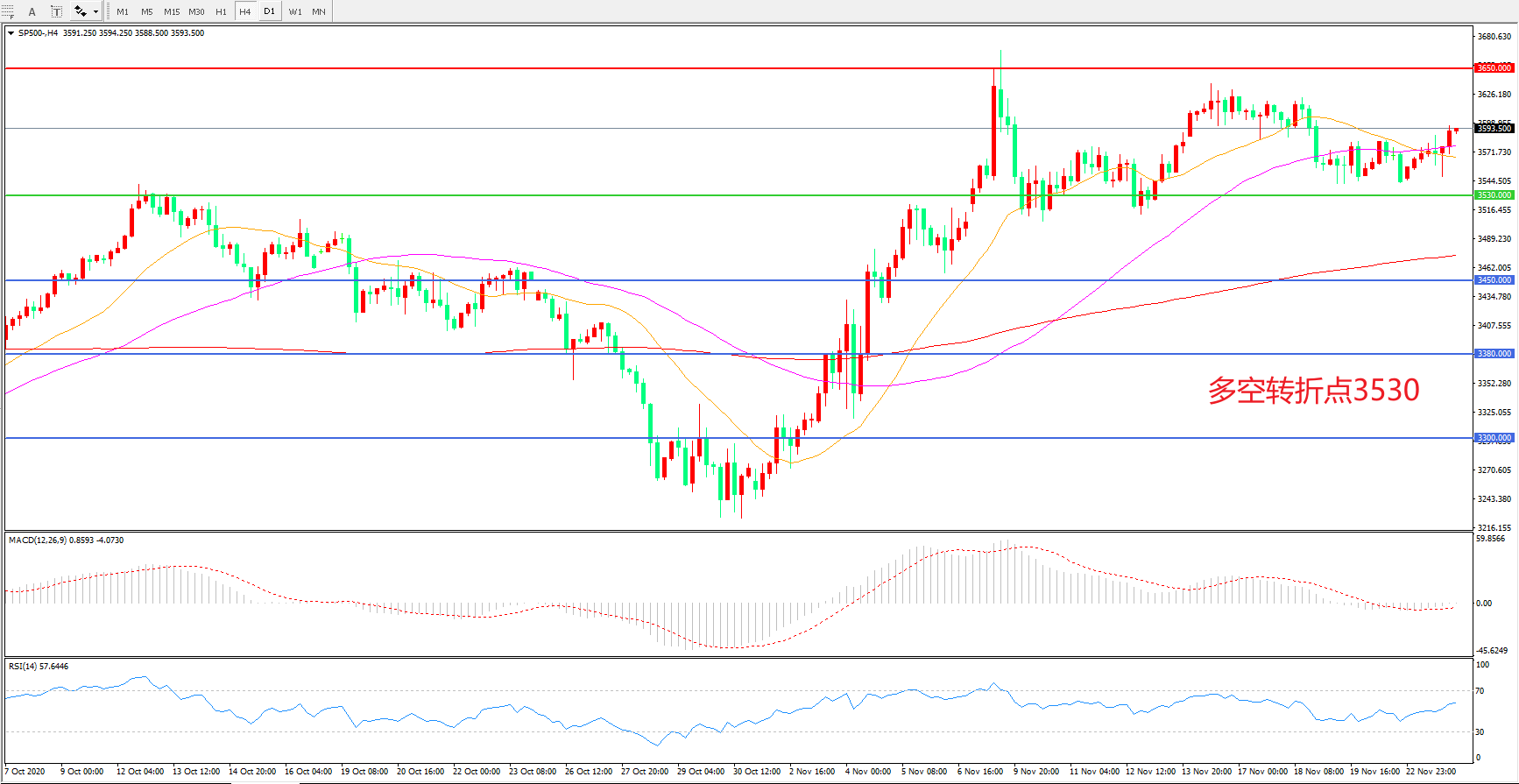 周一(11月24日),牛津大学的疫苗再传利好,经济数据向好,能源等经济复苏敏感的板块支持美股上行,标普500走势回暖,收报3591.25点。值得注意的是大型科技股集体收跌,跌近3%的苹果领跌,奈飞跌超2%。对新冠肺炎接种疫苗的希望增强,以及选举不确定性的结束,促使人们对未来一年的乐观情绪达到自2014年5月以来的最高水平。
