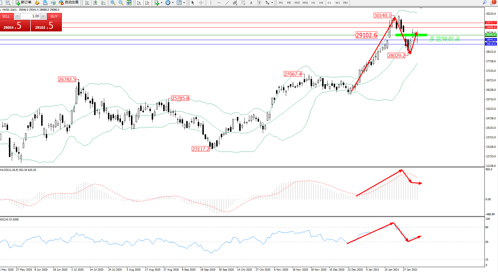 技术点评:多头动力延续布林带指标通道中上轨区间持续震荡上扬至30140位置节点后遇阻开始急速回撤下行,抵达28029位置得到支撑后再度反转向上拉升上扬,处于布林带指标中轨上方震荡数日之久,多空动力短期处于焦灼状态,布林带指标呈收口走势持续中,MACD指标处于多头区域高位震荡回撤后开始走平,RSI指标处于多头区域高位回撤至50均衡线附近节点后得到支撑反转上行中;
