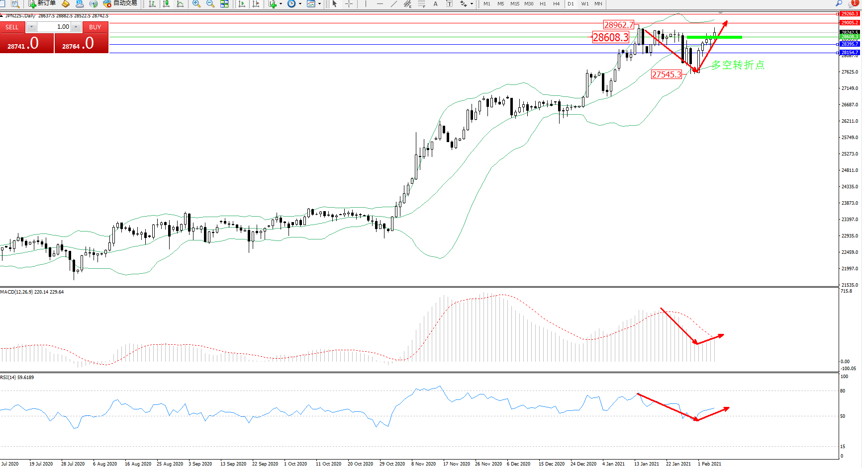 日经225指数2月5日(周五)收盘上涨435.55点,涨幅1.54%,报28777.50点。阿斯利康的疫苗终于在日本市场获批,然而日本方面仍要到2月17日才会开始铺开全面接种新冠病毒疫苗,此行动在主要发达体中已经属于最为滞后。而这也是日元近期失去避险属性遭到市场冷落的原因之一。除此之外,本周日本奥组委再度卷入丑闻纠纷令东京奥运会的举办前景继续蒙上阴影,据日本共同社:日本东京都知事小池百合子表示,东京奥组委主席森喜朗个人的言论问题令奥运会面临重大问题。奥委会的责任是举办一场安全可靠的运动会。日本神奈川县288例新冠肺炎确诊病例,新增11例死亡病例。日本央行行长黑田东彦:股价反映企业利润总体前景。去年市场不稳定时,日本央行的ETF购买帮助缓解了市场压力。日本央行的ETF政策致力于防止市场动荡损害家庭和企业信心。