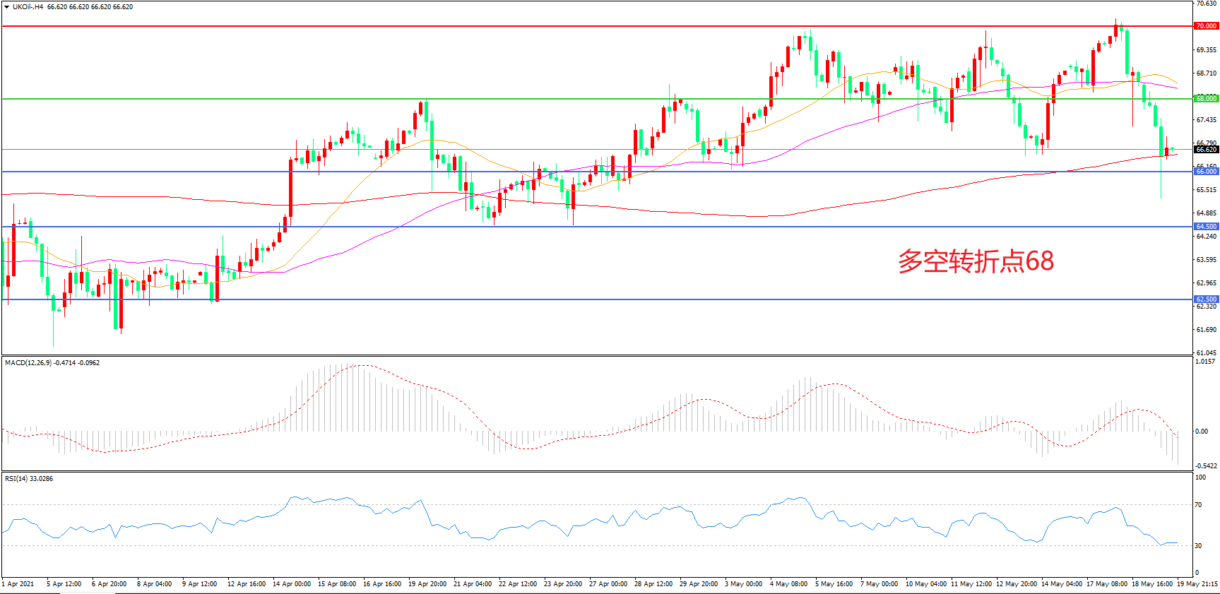 4小时图看,油价长阴破位,短期走势相对低迷,200均线成为下方支撑,68美元成为上方阻力,MACD绿柱增加,RSI指标走平,日内延续震荡概率较大。