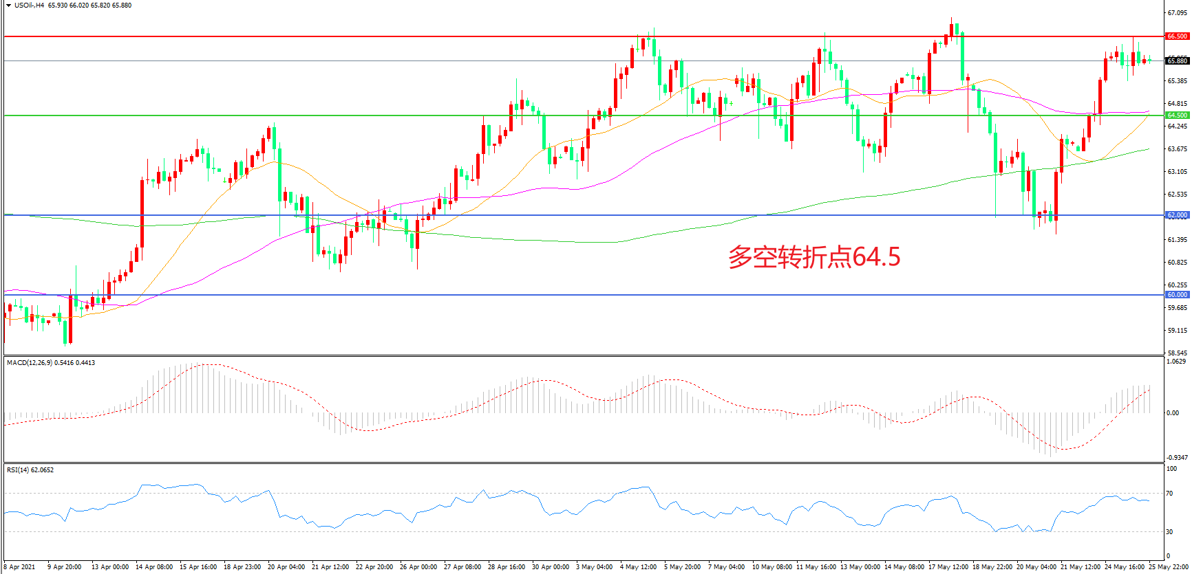 周二(5月25日),美元指数在美联储官员重申保持宽松的信号后进一步下跌,给原油价格形成了一定的支撑,不过市场明显在此位置悬停,等待伊核协议的最终结果。美国WTI原油延续高位震荡,收报65.84美元/桶。由于经济恢复仍在进行,美联储此时并不敢大幅的收缩资产购买计划。即便是通胀率飙升,美联储也不敢承认通胀真正的到来,只能以暂时性的说辞来安抚市场。市场也明白美联储言辞背后的含义,因此美元指数不断走低,